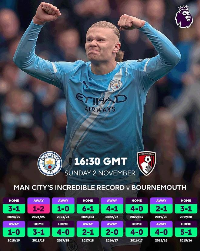 北京时间11月1日,英超官方预热了本周末曼城主场对阵伯恩茅斯的联赛第10轮比赛,虽然目前蓝月亮仅排名第5,而樱桃军团高居第2,但两队的历史交锋却成一边倒的趋势。