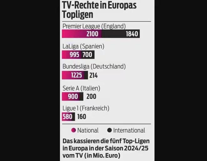 如果说更加直观的数据就是转播收入,我们以2024/25赛季为例,英超的国内转播21亿欧、海外转播18.4亿欧共计39.4亿欧,在五大联赛中遥遥领先。西甲国内9.95亿欧、海外7亿欧合计16.95亿欧排在第二,德甲国内12.25亿欧、海外2.14亿欧合计14.39亿欧排在第三,曾经贵为世界第一联赛的“小世界杯”意甲只有国内9亿欧、海外2亿欧合计11亿欧,排在第四位,只比没什么存在感的法甲高一些而已。特别是海外转播权,意甲只有2亿欧,是西甲的28.6%、英超10.9%!